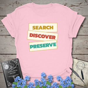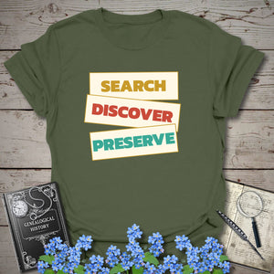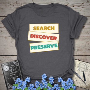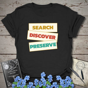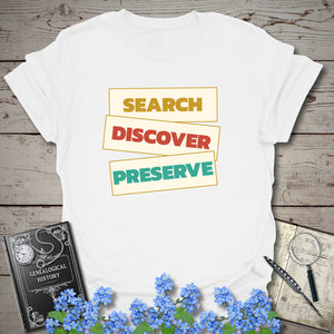 Celebrate the heart of genealogy with a bold statement tee made for family-history lovers, record chasers, and story keepers. Featuring the powerful phrase “Search. Discover. Preserve.” in a stacked vintage-inspired layout, this design captures the full journey of uncovering the past and protecting it for future generations. 🌳📜